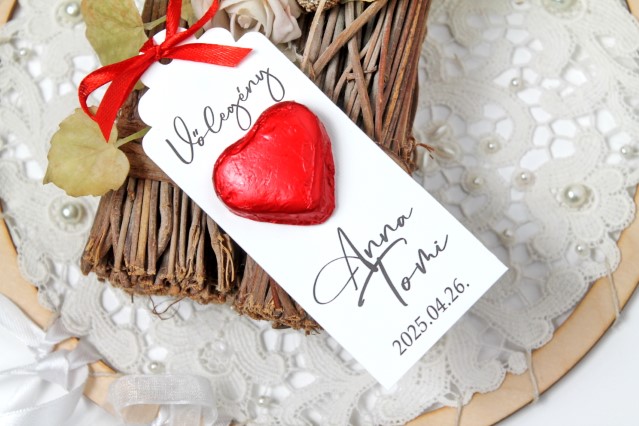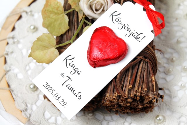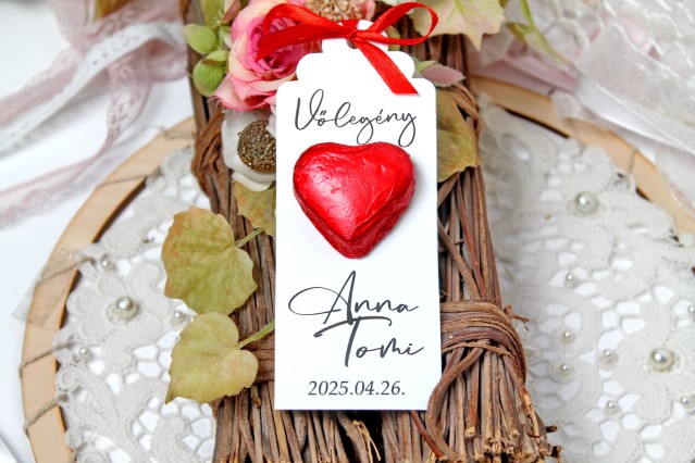 Ez a szív alakú csokoládé elegáns, keskeny kártyán érkezik, amelyre a „Köszönjük!” felirat vagy akár a vendég neve is rákerülhet, alatta pedig a Ti nevetek